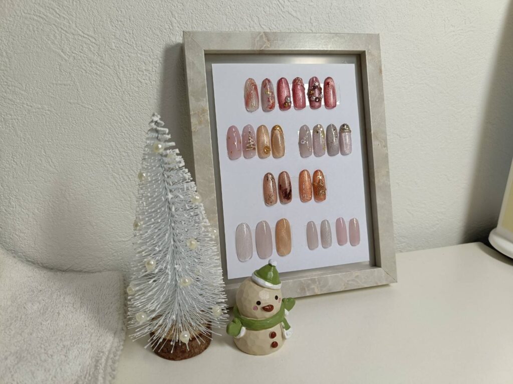 来週ご来店予定のジェルネイルのお客様に向けて、新しいクリスマスネイルのサンプルを作りました。